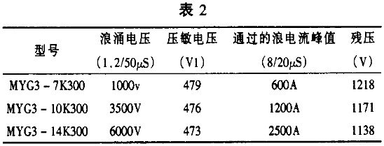 另外,表2 為一組Ф7、Ф10 或Ф14 等不同片徑的壓敏電阻器通流試驗(yàn)情況,從表中可以看出,對于不同片徑的壓敏電阻器,其所能承受的浪涌電流也不一樣。通常,對于使用同一配方制作的壓敏電阻器,片徑越大,壓敏電阻器能承受的最大峰值電流也就越大,相應(yīng)的殘壓也會(huì)有所增加,但其增加的程度遠(yuǎn)遠(yuǎn)低于通流的增加幅度。因此,選型時(shí),應(yīng)根據(jù)線路的耐壓水平,外界可能產(chǎn)生的電涌電壓,盡可能選擇通流比較大的壓敏電阻器,以保證線路長期持續(xù)的正常工作。