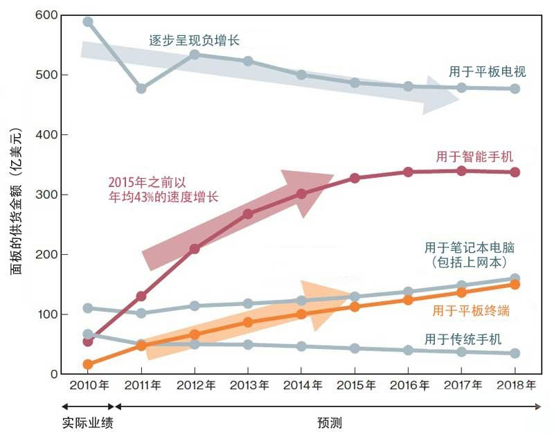 日韓臺的面板廠商開始將業務重心從電視機用大型面板轉向智能手機和平板終端使用的中小型面板。今后,技術開發競爭將越來越激烈。