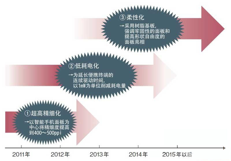 ①超高精度化的目標是,能在智能手機面板上顯示1920×1080像素的全高清影像。為此,需要將分辨率由目前的330ppi提高至400~500ppi。②低耗電量化方面,為延長便攜終端的連續驅動時間,需要以1mW為單位不斷削減耗電量。③柔性化方面,為實現具有高堅固性和高形狀自由度的面板,需要采用樹脂基板。