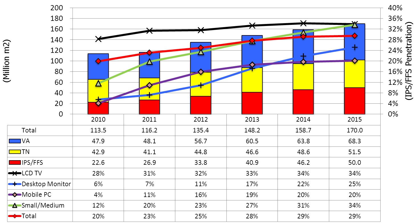 在液晶電視市場,廣視角一直是主要的賣點之一,其中IPS/FFS LCD面板的滲透率在2011年達到31%。在桌上型顯示器市場, IPS/FFS 面板傅統(tǒng)上被用在一些特殊應(yīng)用,例如醫(yī)療設(shè)備,2011年滲透率為7%,而NPD DisplaySearch預(yù)測這個數(shù)字在2015年將上升到25%,主因于IPS面板的領(lǐng)導(dǎo)生產(chǎn)商LG Display計劃使IPS成為桌上型顯示器面板的標準。