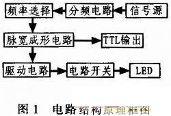 對(duì)水下成像系統(tǒng)而言,光源的選擇至關(guān)重要,光源的穩(wěn)定性、均勻性、響應(yīng)速度及其光波波長(zhǎng)范圍是系統(tǒng)成像的關(guān)鍵。采用藍(lán)光LED所發(fā)出光光經(jīng)過(guò)水介質(zhì)——目標(biāo)反射——水介質(zhì)——接收光學(xué)系統(tǒng),最終在成像傳感器(CCD,ICCD)上成像。這就決定了LED必須工作在快脈沖驅(qū)動(dòng)方式下,目前市場(chǎng)上的驅(qū)動(dòng)電路一般均丁作在慢脈沖驅(qū)動(dòng)模式(μs量級(jí)),遠(yuǎn)不能滿足我們的要求。因此,我們必須自己解決快脈沖驅(qū)動(dòng)電路這一難題,尤其是實(shí)現(xiàn)以ns量級(jí)的大功率快脈沖來(lái)驅(qū)動(dòng)大功率的LED。基于這種實(shí)驗(yàn)實(shí)際需求,我們研究開(kāi)發(fā)了此種快脈沖驅(qū)動(dòng)電路。該電路的基本功能是產(chǎn)生低頻、快速、大功率驅(qū)動(dòng)電流脈沖信號(hào),輸出脈沖的頻率與周期精確度高,穩(wěn)定性好,脈沖信號(hào)寬度在20~100 ns內(nèi)分5檔可調(diào),輸出在50 Hz的基準(zhǔn)頻率下工作。脈沖信號(hào)通過(guò)驅(qū)動(dòng)電路,輸出一個(gè)快脈沖信號(hào)驅(qū)動(dòng)輸出電流開(kāi)關(guān),產(chǎn)生一個(gè)大電流脈沖信號(hào)驅(qū)動(dòng)一個(gè)大功率LED。為了達(dá)到設(shè)計(jì)要求和目的,我們采用晶振電路產(chǎn)生高精度頻率/周期基準(zhǔn)脈沖作為內(nèi)置信號(hào)源,通過(guò)對(duì)基準(zhǔn)脈沖進(jìn)行多次分頻,產(chǎn)生所需頻率的輸出脈沖信號(hào),這樣可以獲得頻率穩(wěn)定的脈沖信號(hào),同時(shí)實(shí)現(xiàn)了頻率選擇。經(jīng)過(guò)分頻后的脈沖信號(hào)再經(jīng)過(guò)脈沖寬度成形電路實(shí)現(xiàn)脈寬調(diào)節(jié),然后經(jīng)過(guò)電流開(kāi)關(guān)電路,產(chǎn)生大電流脈沖,使LED發(fā)光。該驅(qū)動(dòng)電路主要由以下幾個(gè)部分組成:信號(hào)源、分頻電路、頻率選擇、脈沖寬度電路、TTL輸出、驅(qū)動(dòng)電路和電流開(kāi)關(guān)電路。其框圖如圖1所示。