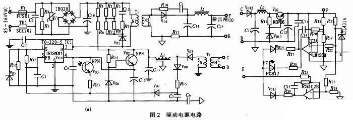 基于IRIS4011的電路由輸入保護(hù)電路,EMI抑制電路,輸入整流濾波電路,直流變換電路,輸出濾波電路,輔助供電電路,二次恒壓/恒流反饋電路組成。輸入電壓:85~264 VAC;輸入頻率47~63 Hz;輸出電壓5~24 VDC;輸出電流2.5 A;恒流精度±2.5%;最大輸出功率:60 W。利用變壓器的電感與瓷片電容實(shí)現(xiàn)準(zhǔn)諧振工作模式,電路簡(jiǎn)單,可靠性高。準(zhǔn)諧振控制模式,能提高電路的轉(zhuǎn)換效率,降低EMI干擾。用放大器來(lái)實(shí)現(xiàn)恒壓、恒流控制,可以得到很高的控制精度。在輸出電流比較大的電路中,必須用放大器控制形式才能提高控制精度與提高電路轉(zhuǎn)換效率。限于篇幅,把電路圖分成2部分,具體的電路如圖2所示。