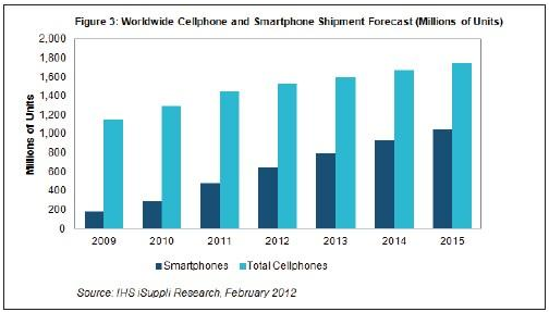 IHS公司的資深首席分析師Steve Mather 認(rèn)為,2015年全球手機銷量將達(dá)17億部,其中10億部將是智能手機。這意味著2015年超過70億的人口中,14%將購買智能手機,如圖3所示。這個規(guī)模十分驚人,全球科技供應(yīng)鏈紛紛調(diào)整方向,脫離電腦產(chǎn)業(yè),投身于智能手機市場。時間框架:三年。
