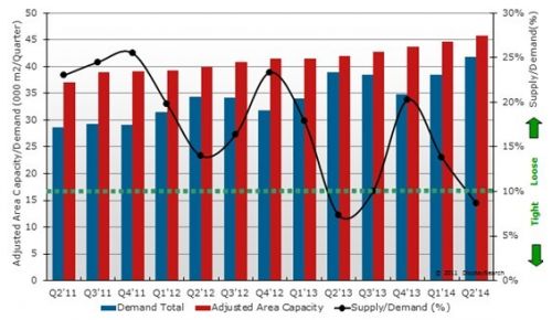 由于面板廠商在過去六個季度連續虧損,且產業處于不景氣階段且仍將維持一段時間,面板廠商凍結了所有液晶電視產線的擴張計劃。與此同時,面板價格下降,增加了市場需求,尤其是50寸及以上的大尺寸電視面板。因此NPD DisplaySearch預測特別是在2013年,面板供需平衡將較為緊張,供需過剩比將自2010年第二季度以來首度下降到10%以下。由此,NPD DisplaySearch預計平板產業將開始新的循環周期,面板價格將逐步上升,利潤得以提高,并促使投資增加。