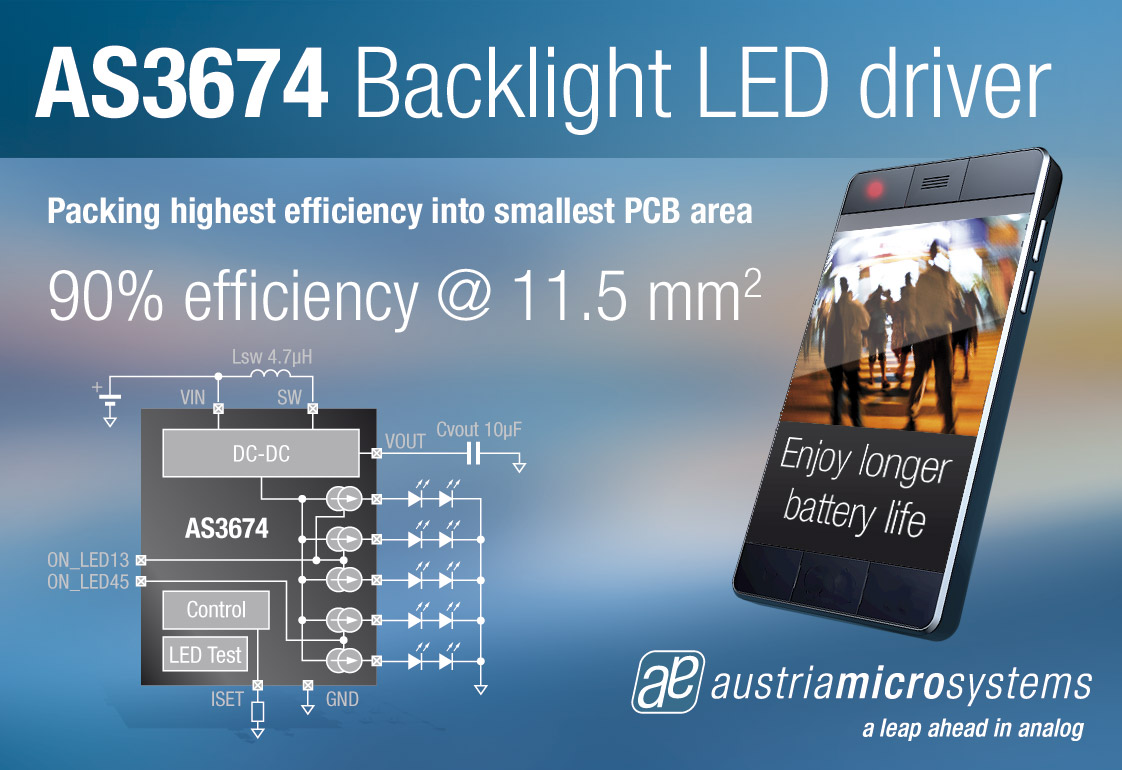 全球領先的高性能模擬IC設計者及制造商奧地利微電子公司(SIX股票代碼:AMS)宣布推出應用于智能手機LCD顯示屏的AS3674及AS3490兩款LED背光燈驅(qū)動器芯片。新品具有業(yè)內(nèi)最高效能,峰值可達90%,包括DC-DC轉(zhuǎn)換器和電流源。PCB封裝僅為11.5 mm2 ,并只需4個外接組件。AS3674及AS3490非常適合應用于智能手機和其他將空間列為首要需求的移動設備。