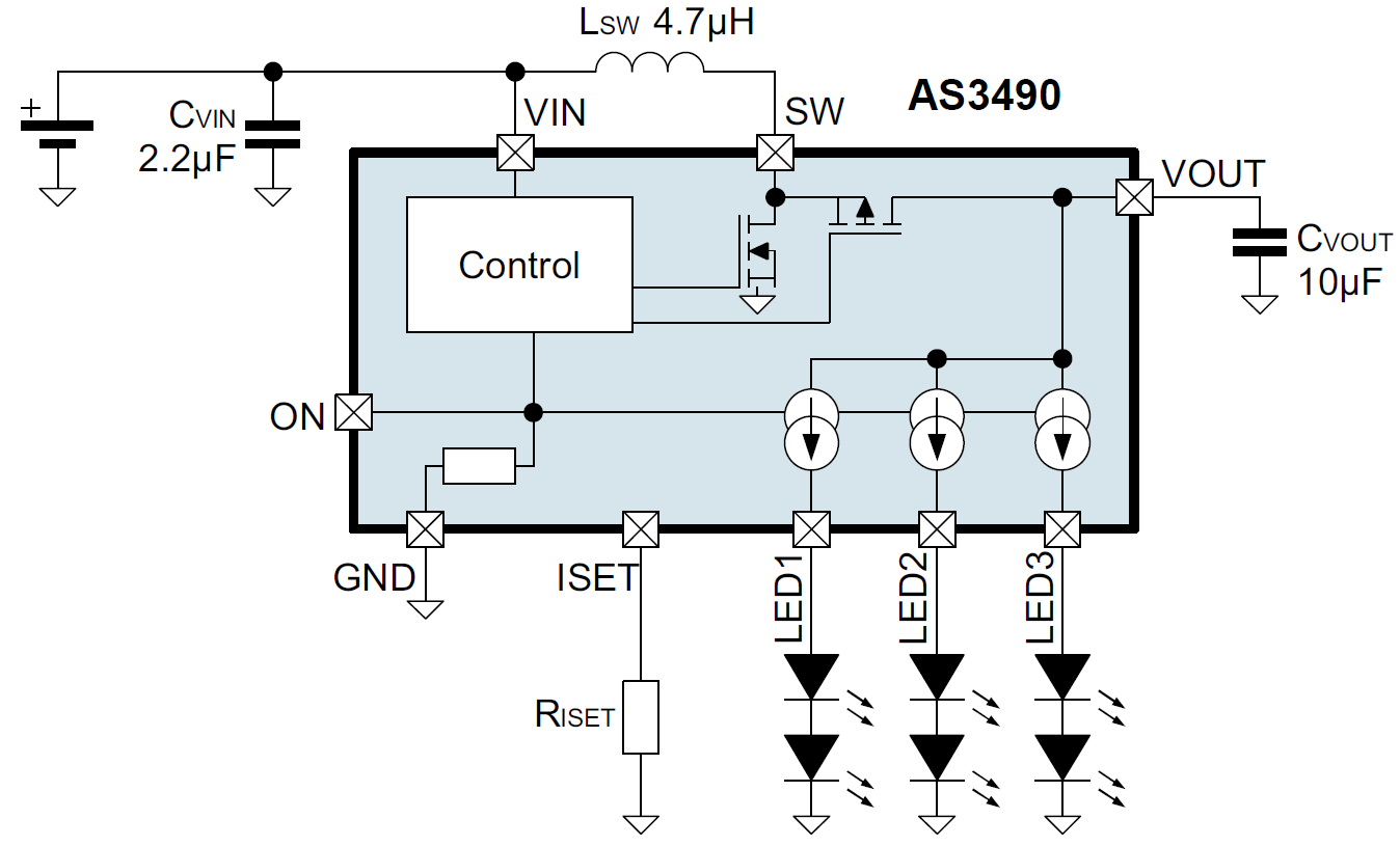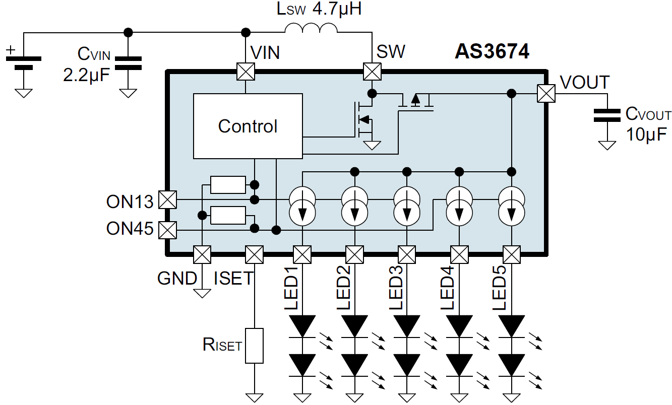 軟啟動的特點使AS3674更容易集成到對噪音敏感的無線射頻系統(tǒng)中。AS3674由兩組輸入電路控制,也可用介于100-800赫茲的PWM電路控制,實現(xiàn)1:2000的調(diào)光比。單通道兩個LED的配置結(jié)合2 MHz的轉(zhuǎn)換器操作頻率,實現(xiàn)使用諸如4.7µH電感的微小外部組件并取得優(yōu)于競爭對手最高達6%的高效率。