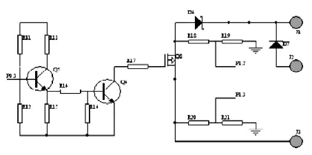 為了在夜間不同時刻采用不同的亮度,以達(dá)到節(jié)約電能的目的,本系統(tǒng)設(shè)計了兩路負(fù)載輸出,晚上12點以前兩盞LED皆亮,12點后一盞點亮,每路輸出均有立的控制和檢測。設(shè)計采用了PWM功率控制功能對LED燈具實現(xiàn)無級調(diào)光。單路原理如圖3所示。其中單片機P0.6 口給出控制信號, 即P 0 . 6 = 1 時, 三極管導(dǎo)通,繼電器閉合,MOS管導(dǎo)通,蓄電池向路燈供電。在電量不足或白天時,控制端輸出低電平信號,切斷供電回路。夜晚蓄電池電量不足情況下由市電供電系統(tǒng)給LED路燈供電,保證系統(tǒng)的完整和可靠。