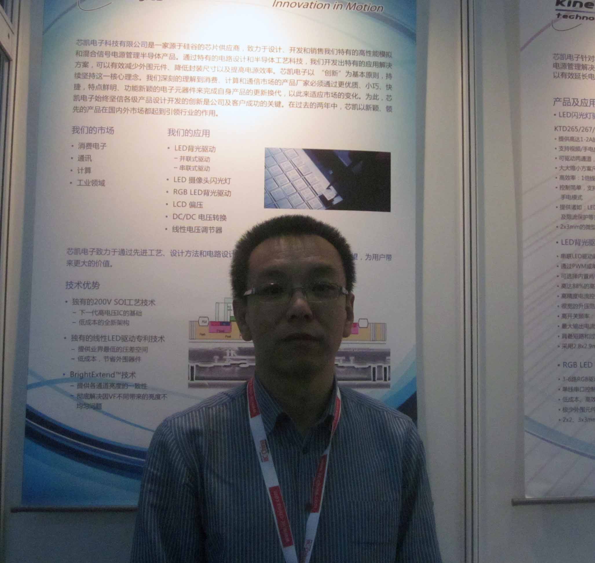 據了解芯凱電子針對移動電話和智能手機推出的全系列電源管理的解決方案及產品十分受歡迎,通過這些優化的產品可以有效延長電池壽命,減少尺寸并降低成本。芯凱在在手機應用領域的產品十分成熟,銷售也能占到公司產品70%以上,在大陸、臺灣、韓國的市場都有不錯銷售業績,三星也是他們重要的客戶之一。據劉宏表示,他們要做的是成熟的產品,并認為只要你的芯片做好,所選外圍的組件減少了,那么性價比就更高。