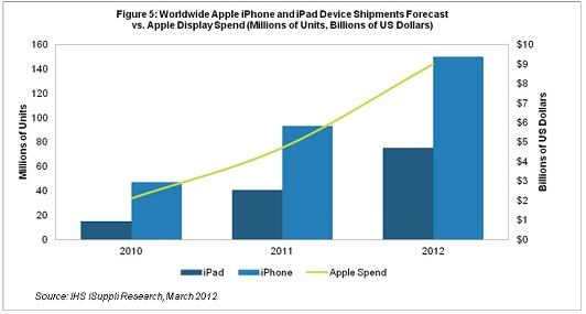 據(jù)IHS iSuppli公司的研究報(bào)告,由于預(yù)計(jì)iPhone和iPad產(chǎn)品出貨量今年大幅增長(zhǎng),蘋(píng)果2012年可能在這兩款產(chǎn)品的顯示器面板上面支出90億美元,進(jìn)一步確保其在平板電腦和手機(jī)市場(chǎng)中的主導(dǎo)地位。