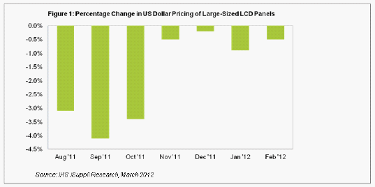 2月份大尺寸液晶面板的總體價(jià)格僅下降0.5%,跌幅小于1月份的0.9%,如圖1所示。過去四個(gè)月的價(jià)格平均跌幅是0.5%,顯示市場趨于穩(wěn)定。從2011年8月到10月,大尺寸面板價(jià)格每月下跌達(dá)3-4%。大尺寸面板是指尺寸為10.x英寸或更大的面板。