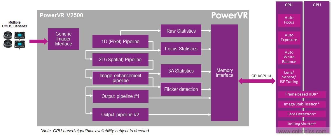V2500 內核加入 Imagination 現有的 PowerVR 多媒體內核系列后,與新的 PowerVR Series6XT圖形處理器和 PowerVR Series5 視頻與靜態圖像編解碼器一起,形成了一個完整、整合的視覺平臺,能為今天的相機應用顯著節省電源與帶寬,并為臉部和姿勢識別、增強現實等下一代內容感知應用奠定基礎。
