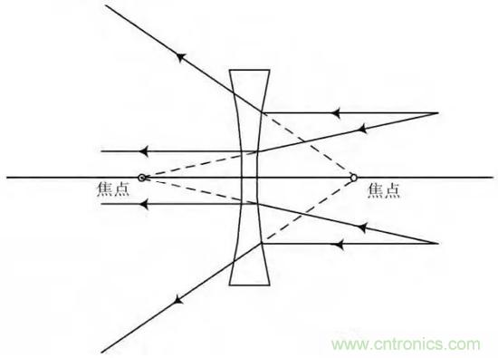 由于紫外光的散射傳播特性,UV LED的視場角和檢測器的視場角重疊的區(qū)域越大,接收到的光能量就越多,接收信噪比就越高。考慮到系統(tǒng)選用的UV?LED的視場角只有10°,為了增大收發(fā)雙方在存在視線遮擋情況下的重疊區(qū)域,需要通過光學(xué)透鏡增大發(fā)送光源的視場角。凹透鏡能夠?qū)θ肷涔馐鸢l(fā)散作用,如圖2所示,所以通過多個(gè)凹透鏡的組合并調(diào)節(jié)UV?LED和凹透鏡的距離,就可以得到滿足要求的發(fā)射視場角。