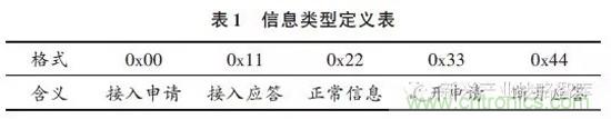 以容量為10人的紫外光語音通信系統(tǒng)為例說明數(shù)據(jù)幀結(jié)構(gòu)的設(shè)計(jì)。考慮到通常情況下人講話的語速為每分鐘160~180個(gè)漢字,在保留一定余量的情況下,假設(shè)每分鐘240個(gè)漢字,如果壓縮后的語音信號(hào)速率為4.8Kb/s,可以算出平均每個(gè)漢字時(shí)間內(nèi)的比特?cái)?shù)為1200b。據(jù)此設(shè)計(jì)的數(shù)據(jù)幀結(jié)構(gòu)如圖3所示,其中數(shù)據(jù)的信息速率為60Kb/s,信息體長度為1200b,時(shí)隙頭長度為96b。時(shí)隙頭包括前導(dǎo)序列、信息類型、發(fā)送方代號(hào)和接收方代號(hào),長度分別為72b,8b,8b和8b。每一個(gè)用戶只處理接收代號(hào)和自己的代號(hào)一致的時(shí)隙。收發(fā)雙方作為一個(gè)組合占用相鄰的兩個(gè)時(shí)隙。前導(dǎo)序列為0,1交替的序列,信息類型的定義如表1所示。