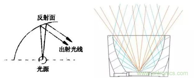 例如我們希望得到一個(gè)超窄光束角,如果使用鹵素?zé)糁椋◤U話(huà)熒光燈當(dāng)然不行了…),需要計(jì)算一個(gè)拋物線(xiàn)反射面,抓取燈珠往反射器方向這一半的光,變成平行光發(fā)出,同時(shí)還要遮蓋掉燈珠往外方向的光,以避免影響配光曲線(xiàn)(可參考QR111的結(jié)構(gòu),金鹵燈原理相同)。