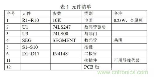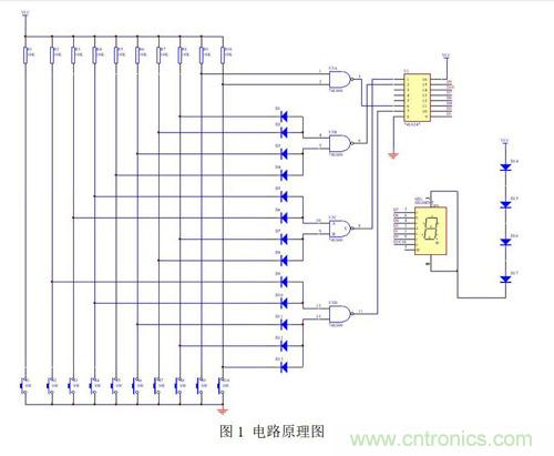 如圖1所示,電路由與非門74LS00、數(shù)碼管驅動芯片74LS247組成。10個按鍵組成輸入電路,經(jīng)過與非門電路編碼后,輸入數(shù)碼管驅動芯片,驅動數(shù)碼管顯示相應的按鍵號。