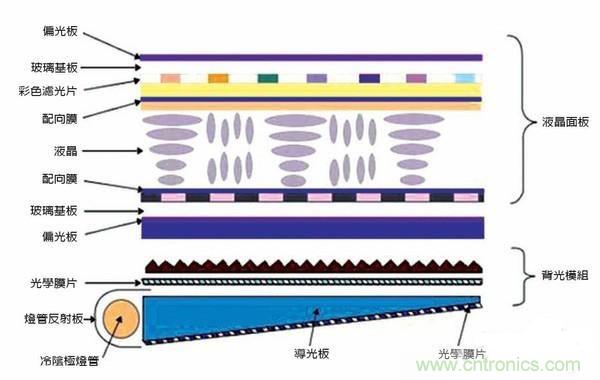 我們先來看看歷史已久的LCD顯示技術,LCD顯示屏結構非常復雜,LCD 的構造是在兩片平行的玻璃基板當中放置液晶盒,下基板玻璃上設置TFT(薄膜晶體管),上基板玻璃上設置彩色濾光片,通過TFT上的信號與電壓改變來控制液晶分子的轉(zhuǎn)動方向,從而達到控制每個像素點偏振光出射與否而達到顯示目的。