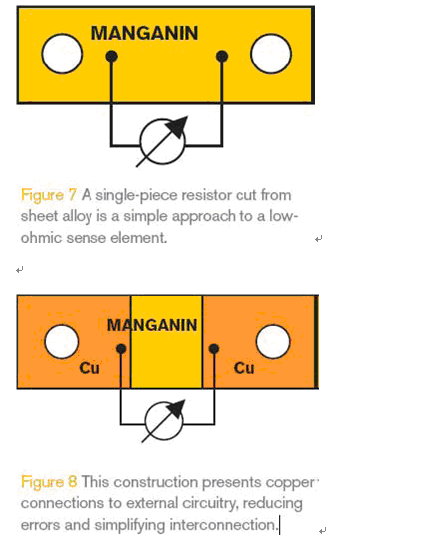 四引線設(shè)計推薦用于大電流和低阻值應(yīng)用。通常的做法使用錳鎳銅合金帶直接沖壓成電阻器(圖7),但這不是最好的辦法。盡管四引線電阻有利于改進溫度特性和熱電壓,但總阻值有時高出實際阻值2到3倍,這會導(dǎo)致難以接受的功率損耗和溫升。此外,電阻材料很難通過螺絲或焊接與銅連接,也會增加接觸電阻以及造成更大的損耗。