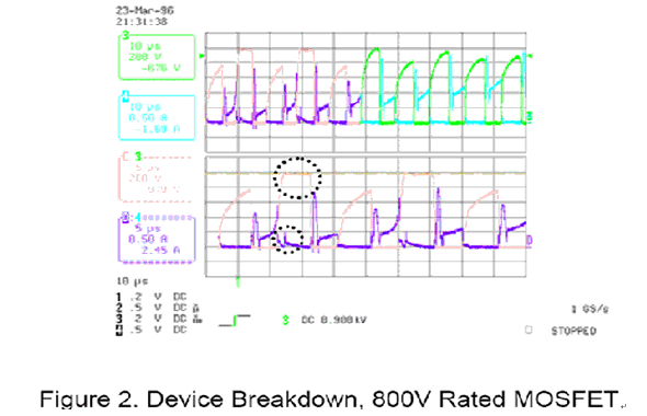 當(dāng)場(chǎng)效應(yīng)晶體管進(jìn)入崩潰效應(yīng)時(shí) Drain 及 Source 電壓會(huì)被嵌制在其崩潰電壓 , 而電流會(huì)經(jīng)由寄生的二極管而產(chǎn)生逆向操作電流的現(xiàn)象。如圖二所示為一典型開(kāi)關(guān)式電源電路所量測(cè)到的崩潰現(xiàn)象。從圖中可看出 Drain 及 Source 的電壓 (CH3) 被箝制在 1KV 而且逆向電流 (CH4) 可清楚地被發(fā)現(xiàn)。