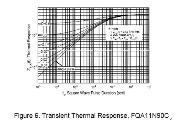 舉例說(shuō)明 , 當(dāng)一個(gè) 2KW 的電源脈沖加至 FQA11N90 的脈沖時(shí)間為 1uS 時(shí) , 我們可依據(jù)圖六的曲線(xiàn)算出此脈沖功率對(duì)接合面所產(chǎn)生的溫升為