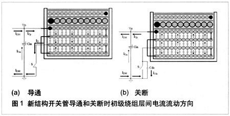 對于常規(guī)的4層初級繞組結(jié)構(gòu),在開關(guān)管導(dǎo)通和關(guān)斷的過程中,層間的電流向同一個方向流動。在圖1中,在開關(guān)管導(dǎo)通時,源極接到初級的地,B點電壓為0,A點電壓為Vin,基于電壓的變化方向,初級繞組層間電容中電流流動方向向下,累積形成的差模電流值大。在功率器件關(guān)斷瞬間,MOSFET漏-源極電容充電,變壓器初級繞組的層間電容放電,這兩部分電流也會形成差模電流。同樣,基于電壓的變化方向,初級繞組層間電容中的電流流動方向向上,累積形成的差模電流值大。