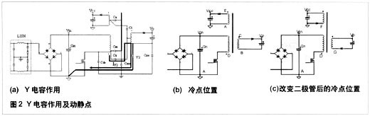 共模電流在輸入及輸出線與大地間流動,主要有下面幾部分:通過MOSFET源級到大地的電容Cde。如果改進(jìn)IC的設(shè)計,如對于單芯片電源芯片,將MOSFET源極連接到芯片基極,用于散熱,而不是用漏極進(jìn)行散熱,這樣可以減小漏極對大地的寄生電容。PCB布線時減小漏極區(qū)銅皮的面積可減小漏極對大地的寄生電容,但要注意保證芯片的溫度滿足設(shè)計的要求;通過Cm 和Cme產(chǎn)生共模電流;通過Ca和 Cme產(chǎn)生共模電流;通過Ct和Coe產(chǎn)生共模電流;通過Cs和Coe產(chǎn)生共模電流,這部分在共模電流中占主導(dǎo)作用。減小漏極電壓的變化幅值及變化率可減小共模電流,如降低反射電壓,加大漏-源極電容,但這樣會使MOSFET承受大的電流應(yīng)力,其溫度將增加,同時加大漏-源極電容,產(chǎn)生更強(qiáng)的磁場。如果系統(tǒng)加了Y電容,如圖2所示,通過Cs的大部分共模電流被Y 電容旁路,返回到初級的地,因為Y電容的值大于Coe。Y電容必須直接并用盡量短的直線連接到初級和次級的冷點。如果導(dǎo)通時MOSFET的dV/dt大于關(guān)斷時的值,Y電容則連接到初級的地,反之連接到Vin。