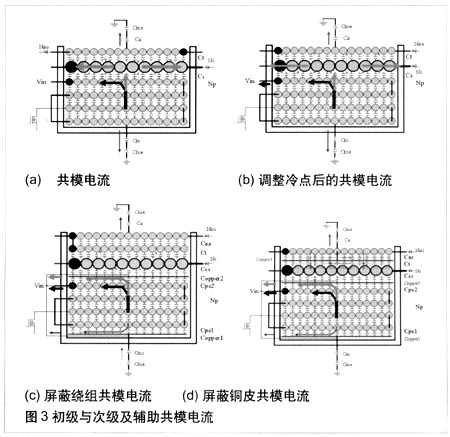 如果對變壓器的結(jié)構(gòu)進(jìn)行改進(jìn),如圖1所示,通過補(bǔ)償?shù)姆绞娇梢詼p小差模電流。注意:初級繞組的熱點應(yīng)該埋在變壓器的最內(nèi)層,外層的繞組起到屏蔽的作用。同樣,基于電壓的變化方向,可以得到初級繞組層間電容的電流方向,由圖1所示可以看到,部分層間電流由于方向相反可以相互抵消,從而得到補(bǔ)償。