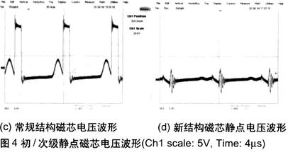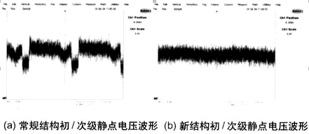 測量變壓器初級和次級靜點的電壓波形及變壓器磁芯的電壓波形,可以為EMI的傳導(dǎo)測試提供一些參考(見圖4)。常規(guī)結(jié)構(gòu)變壓器的初級和次級靜點電壓波形的幅值為10V,并且可以明顯地看到基于開關(guān)頻率的開關(guān)波形。新結(jié)構(gòu)變壓器的初級和次級靜點電壓波形的幅值為5V,基于開關(guān)頻率的開關(guān)波形不是很明顯。常規(guī)結(jié)構(gòu)的變壓器的磁芯電壓波形的幅值為18V,可以明顯地看到基于開關(guān)頻率的開關(guān)波形。新結(jié)構(gòu)的變壓器的磁芯電壓波形的幅值為5V,基于開關(guān)頻率的開關(guān)波形不是很明顯。