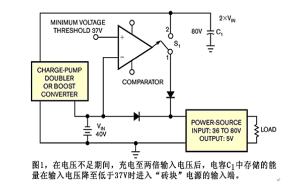 應記住,電容存儲的能量以指數增加,而電容的電壓線性增加。倍增器把C1充電至兩倍輸入電壓或至少為80V。即便假定每10s出現一次5ms電壓不足,用于充電200mF的電流仍僅約為3mA。比較器觀察輸入電壓,并且一旦它降至低于37V,開關S1就會關閉,而來自C1的能量向“磚塊”電源放電。