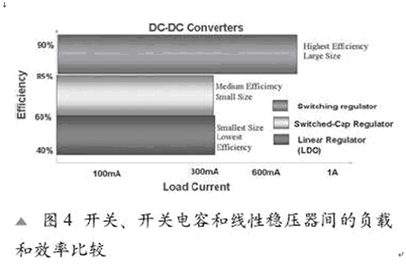 隨著VIN的增長,由轉換器產生的VIN和VOUT 間的增量增長引起功率消耗的增長和效率的下降。解決這個問題的一個方式是轉變成一個更高的效率增益,就像給汽車替換齒輪一樣。圖2顯示了一個開關電容器降壓穩壓器,一個LDO及一個開關電容器的效率曲線。開關電容器具有一個模擬增益控制和增益變化以保持一個給定負載效率的持續性。開關電容器并具有離散增益步驟,由VOUT/(增益 *VIN)與離散增益來決定效率的高低。一個LDO僅有1的增益及三者中最低的效率。開關電容器(SC)穩壓器則有三個不同的電壓增益(2/3,1/2和1/3)。我們可以看到,開關電容穩壓器隨著VIN 的增長,電壓增益從2/3轉到1/2以及從1/2到1/3,因此整個負載范圍的效率達到最大化。這就帶來了在Li-ion 范圍上(3.4V到3.8V)80%的效率。在相同應用中的一個LDO僅能達到50%的效率。根據電感器種類,一個典型的開關穩壓器大約具有88-90%的效率。