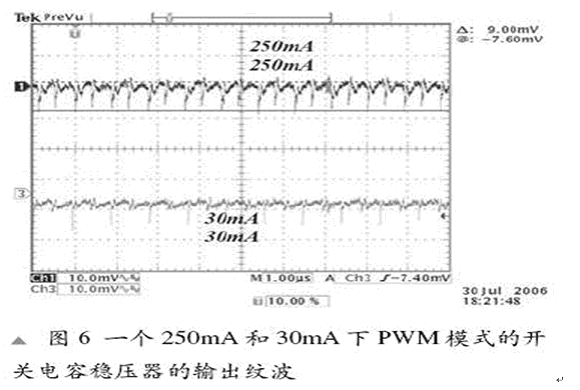 比較新的PWM調控模式處理了PFM架構中的各種頻率和高輸出紋波。大多數的新型開關電容穩壓器都采用PWM調制模式。在這種模式下,功率FET的電阻根據VOUT 和 ILOAD進行控制。這樣做,我們就真正控制了快速電容器(CFLY)所提供的充電量。這也被稱為預調制。在這種模式下,操作頻率和工作周期都是固定的。一個PWM架構的例子是LM2771,圖6顯示出它的輸出紋波。它處于一個帶有4.7mF COUT 的8mV -10mV的順序中。我們可以看到在ILOAD變化的情況下紋波可以持續。一個9mV的紋波輸出可以與在感應開關穩壓器中的紋波相媲美。