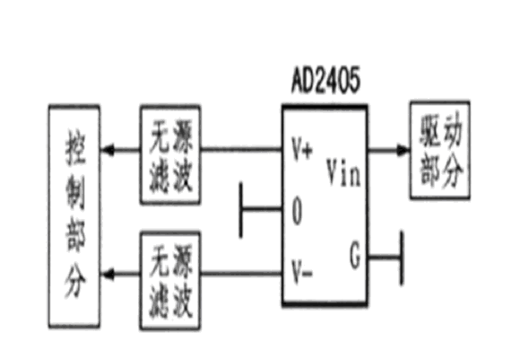 控制電路為弱電部分,極易受到干擾;驅動電路直接與外電路連接,是一個較強的干擾源;為了實現(xiàn)整個設備的電磁兼容,控制電路部分必須與驅動部分隔離。為了避免公共電源對控制電路產生干擾,應對控制電路及驅動電路分別供電,EXB84l的電源電壓為+20 V,一般控制電路的供電電壓為5 V,因此,可以利用圖4所示的DC-DC微功率模塊進行電源隔離,采A2405D型微功率模塊實現(xiàn)電源的隔離。