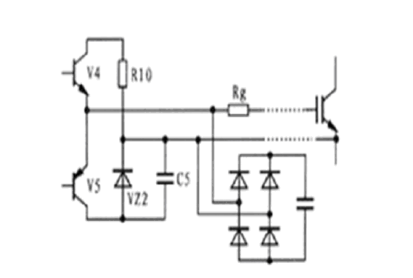 圖5所示為EXB841與IGBT柵-射極之間的連接電路原理圖。當驅動電路中的V4導通時,IGBT處于正常導通狀態(tài),當V5導通時,IGBT柵-射極之間通過穩(wěn)壓管VZ2提供一個-5V電壓加在其兩端,使IGBT關斷,此時V5處于臨界導通狀態(tài),穩(wěn)壓管VZ2處于反向偏置狀態(tài)。但由于集-柵極之間分布電容的影響,集-柵極之間的du/dt增大時,其通過分布電容形成的電流經過,所以,要克服集-柵極之間的du/dt,確保穩(wěn)壓管不過壓,避免IGBT誤導通。克服du/dt的方法有二種:一是驅動電路輸出與IGBT柵-射極之間的連線采用雙絞屏蔽電纜,屏蔽層接地,二是采用快速吸收電路吸收過電壓。