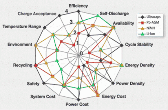Li離子、NiMH等新型電池可以提供一個(gè)可靠的能量?jī)?chǔ)存方案,并且已經(jīng)在很多領(lǐng)域中廣泛使用。眾所周知,化學(xué)電池是通過(guò)電化學(xué)反應(yīng),產(chǎn)生法拉第電荷轉(zhuǎn)移來(lái)儲(chǔ)存電荷的,使用壽命較短,并且受溫度影響較大,這也同樣是采用鉛酸電池(蓄電池)的設(shè)計(jì)者所面臨的困難。同時(shí),大電流會(huì)直接影響這些電池的壽命,因此,對(duì)于要求長(zhǎng)壽命、高可靠性的某些應(yīng)用,這些基于化學(xué)反應(yīng)的電池就顯出種種不足。