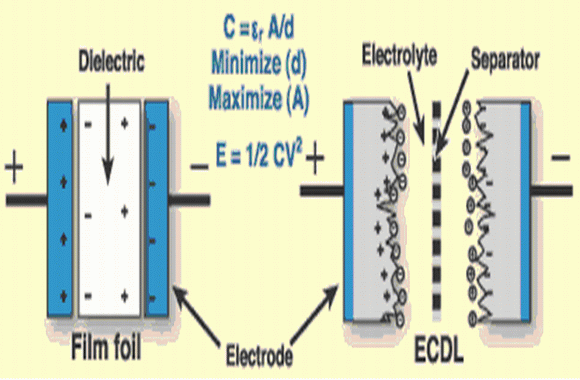雖然,目前全球已有許多家超級(jí)電容器生產(chǎn)商,可以提供許多種類的超級(jí)電容器產(chǎn)品,但大部分產(chǎn)品都是基于一種相似的雙電層結(jié)構(gòu),超級(jí)電容器在結(jié)構(gòu)上與電解電容器非常相似,它們的主要區(qū)別在于電極材料,如圖2所示。