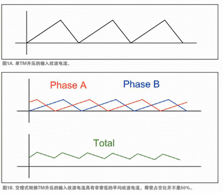 為了生產的更薄、高效而廉價的電源,近來開發了UCC28060,在單一設備中采用兩個交錯式轉換通道TM PFC的集成電路。UCC28060充分發揮了TM的全部優勢,并利用交錯式轉換的優勢來彌補TM的缺點。例如,如圖1A與1B所示,交錯式轉換降低了輸入紋波電流,所以可以使用小得多的EMI濾波器。交錯式轉換還降低了輸出波紋,可使用較小的輸出電容,并能延長電容壽命。交錯式轉換還可將一個大電感分成兩個較小的電感,提高了功率級別并實現了超薄的封裝。
