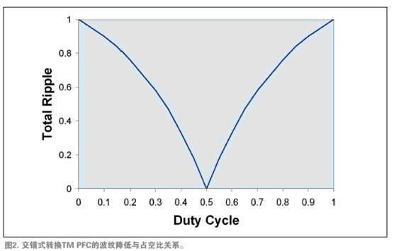 如果交錯式轉換電源轉換器以50%的占空比工作,第一相的輸入波紋完全抑制了第二相的輸入波紋,從而產生無開關成分的輸入電流,且不會產生EMI。在占空比偏離50%時,抑制作用降低,殘余波紋增大(參見圖2)。然而,波紋抑制多數的優點還是實現了。