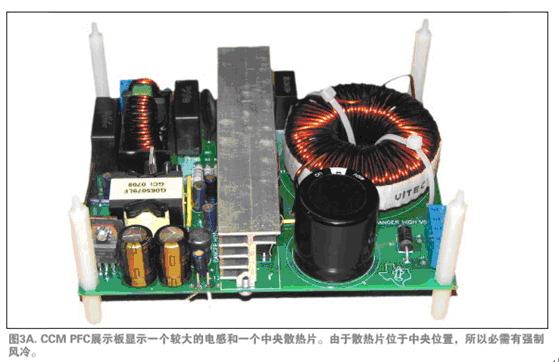 圖3A與3B顯示了兩個原型電源。圖3A是一個有正向轉換器進行輸出穩壓的單相CCM PFC及一個EMI濾波器。在此電源中,電感、大型濾波電容及散熱片體積均較大,位于中央位置,使電源體積略為龐大。圖3B是一個兩相交錯式轉換TM PFC。交錯式轉換電源非常薄,因為電感體積縮小了,輸出濾波器電容尺寸及布局均為散熱而考慮。如果布局采用同樣的規則,交錯式轉換TM PFC也可以縮小體積。