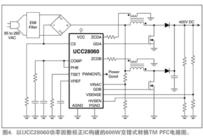圖4顯示了實際交錯式轉換PFC前置調節器的電路圖。盡管部件數多于單階PFC,元件體積很小、成本較低。為了提高輕負載效率,UCC28060還采用了可編程的相管理控制,在輕負載時減為單相運行,并在較低的負載下切換到突發運行。