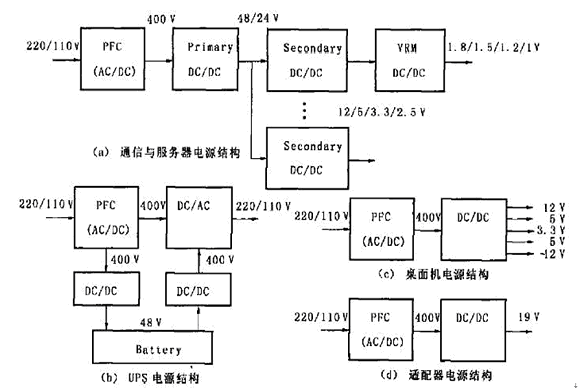 圖1(c)是桌面機(例如個人電腦)的電源結構。先由PFC電路將市電變換成400V 的直流電壓,再經過一個多路輸出的DC/DC 變換成多路的較低的直流電壓給不同負載供電。 圖1(d)是筆記本電腦適配器的電路結構。 首先由PFC 將市電變換成400V的直流電壓,然后經過一個DC/DC變換器降壓至19V(典型值)給負載供電。