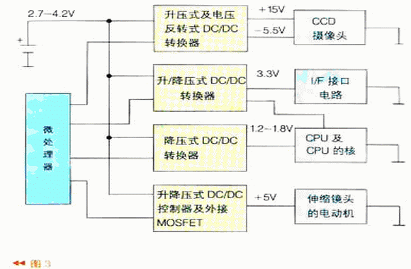 數碼相機中有三種電源:系統電源、LCD電源以及白光LED驅動電源(背光照明及閃光燈電源)。系統電源部分由4個DC/DC轉換器組成,如圖3所示。它分別給CCD攝像頭、I/F接口電路、CPU的核及伸縮鏡頭的電動機供電,通過微處理器可做負載管理,微處理器也可以根據工作狀態要求來控制LCD背光亮度及閃光燈驅動電路。