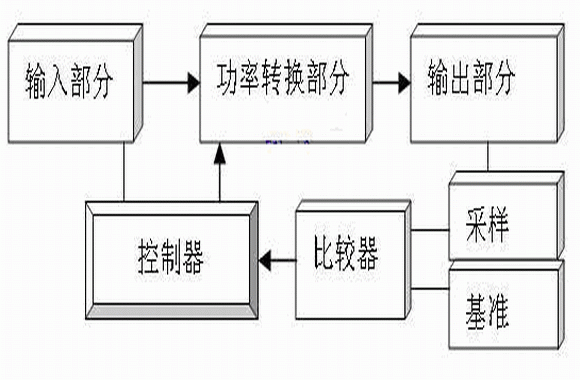 從以上能量反饋系統工作分析可知,能量反饋部分為系統穩定工作提供必要的保證, 能量反饋部分組成可由圖5所示,主要包括:輸入部分、功率轉換部分、輸出部分、采樣、基準、比較器和控制器七個組成部分。