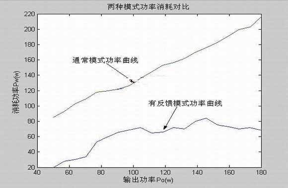 結果分析:在通常工作模式情況下,曲線的波動是由于電能轉換器的轉換效率影響造成的,由前面原理分析可知消耗功率為Pi=Po+Pw, 如果轉換效率為 ,則Pi=Po/η,轉換效率η通常隨著輸出功率的變化有一定的波動,所以曲線的波動符合理論分析;在有反饋的工作模式情況下,由前面原理分析部分得系統的消耗功率為Pi=Pw+Pwf,分別設轉換器1的轉換效率為η1,反饋部分的轉換效率為η2,則系統的消耗功率為: