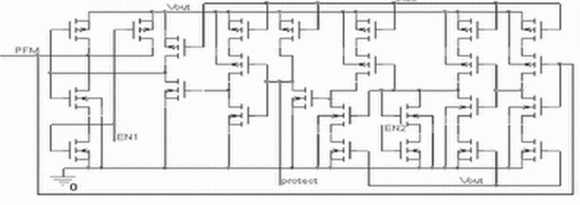 PFM控制電路是由有多個使能端控制的振蕩器組成的,如圖2所示。其中,EN1為誤差放大器CM的輸出,EN2為運放OM的輸出。protect為過流保護的輸出,當M電流超過預定值時,protect控制振蕩器停振,使M斷路,防止損壞。