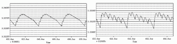 PFM控制電路在模擬時,輸出電壓VOUT的額定值取典型輸出值3.3V,模擬結果如圖3所示。