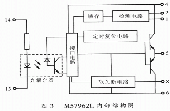 M57962AL是一種14腳單列直捕式結構的厚膜驅(qū)動模塊,其內(nèi)部結構圖如圖3所示。它由光耦合器、接口電路、檢測電路、定時復位電路以及門關斷電路組成,驅(qū)動功率大,町以驅(qū)動600A/600V及400A/l200V等系列IGBT模塊。