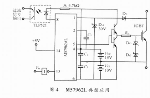 典型應用圖如圖4所示。當驅(qū)動信號通過腳14和腳13時,經(jīng)過高速光耦隔離,由M57962AL內(nèi)置接口電路傳輸至功率放大極,在M57962AL的腳5產(chǎn)生+15V開柵和一10V關柵電壓,驅(qū)動IGBT通斷。當腳1檢測到電壓為7V時,模塊認定電路短路,立即通過光耦輸出關斷信號,使腳5輸出低電平,從而將IGBT的G—E兩端置于負向偏置,可靠關斷。同時,輸出誤差信號使故障輸出端(腳8)為低電平,從而驅(qū)動外接的保護電路工作。延時2~3s后,若檢測到腳13為高電平,則M57962AL恢復工作。穩(wěn)壓管DZ1用于防止D1擊穿而損壞M57962AL,Rg為限流電阻,DZ2和DZ3起限幅作用,以確??煽客〝唷?nbsp;