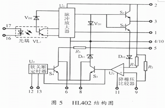 HL402結構圖如圖5所示。圖5中,VL1為帶靜電屏蔽的光耦合器,它用來實現(xiàn)與輸入信號的隔離。由于它具有靜電屏蔽,因而顯著提高了HL402抗共模干擾的能力。圖5中U1為脈沖放大器,S1、S2實現(xiàn)驅(qū)動脈沖功率放大,U2為降柵壓比較器,正常情況下由于腳9輸入的IGBT集電極電壓VCE不高于U2的基準電壓VREF,U2不翻轉(zhuǎn),S3不導通,故從腳17和腳16輸入的驅(qū)動脈沖信號經(jīng)S2整形后不被封鎖。該驅(qū)動脈沖經(jīng)S2、S2放大后提供給IGBT使其導通或關斷,一旦IGBT退飽和,則腳9輸入集電極電壓給IGBT使其導通或關斷,并且腳9輸入的集電極電壓采樣信號VCE高于U2的基準電壓VREF,比較器U2翻轉(zhuǎn)輸出高電平,使S3導通,由穩(wěn)壓管DZ2將驅(qū)動器輸出的柵極電壓VGE降低到10V。此時,軟關斷定時器U3在降柵壓比較器U2翻轉(zhuǎn)達到設定的時間后,輸出正電壓使S4導通,將柵極電壓軟關斷降到IGBT的柵射極門限電壓,給IGBT提供一個負的驅(qū)動電壓,保證IGBT可靠關斷。