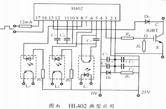 HL402是17腳單列直插式結構,內(nèi)置有靜電屏蔽層的高速光耦合器實現(xiàn)信號隔離,抗干擾能力強,響應速度快,隔離電壓高。它具有對IGBT進行降柵壓、軟關斷雙重保護功能,在軟關斷及降柵壓的同時能輸出報警信號,實現(xiàn)封鎖脈沖或分斷主回路的保護。它輸出驅(qū)動電壓幅值高,正向驅(qū)動電壓可達15~17V,負向偏置電壓可達10~12V,因而可用來直接驅(qū)動容量為400A/600V及300A/1200V以下的IGBT。