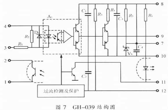 其內(nèi)部結構圖如圖7所示,工作原理與EXB和M57系列模塊相類似,這里不再贅述。而與EXB系列和M57系列的模塊不同的是該模塊已含有保護后發(fā)送報警或動作信號的光耦合器,所以使用中不需要像EXB和M57系列的模塊外接光耦合器,因而更加方便,其性能比EXB和M57系列的模塊在保護性能上更加優(yōu)越;在可靠性方面,由于GH-039是單電源供電,不能提供負偏壓,從而導致ICBT不能可靠地關斷。與HL402相比,CH-039保護功能還不完善,它也同EXB841和M57962AL一樣無降柵壓保護。因此,GH-039驅(qū)動模塊也是有缺陷的。