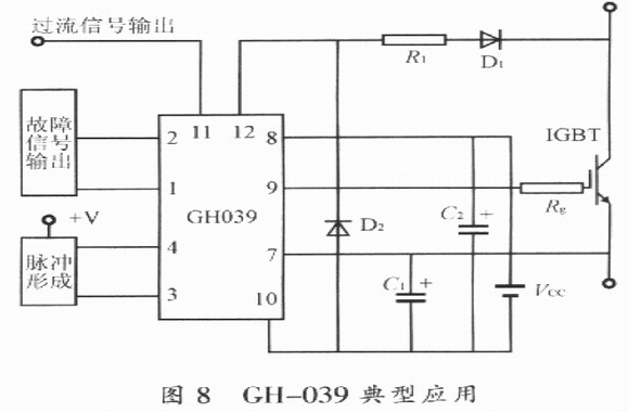 GH-039典型接線圖如圖8所示。工作電源VCC為26V;為了保持電壓穩(wěn)定,濾波電容器應盡可能靠近GH一039模塊安裝和使用,且其電容值不能小于10μF,并應選用高質(zhì)量的電容;串入GH-039腳12與ICBT集電極之間的二極管D1,應選超快速恢復二極管,并且要保證其反向耐壓不低于ICBT的集電極與柵極之間的額定電壓;為防止所連接的過流保護端子光電隔離器的誤動作,應在D1與GH一039的腳12之間串入100Ω的電阻;接于腳lO與腳12之間的D2選用超快速恢復二極管,其反向耐壓可以低于IGBT的集射極間耐壓。